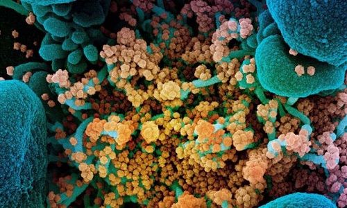 严重感染新冠病毒(黄色)的垂死细胞(蓝色)的彩色扫描电子显微照片。图片来源:美国国家过敏和传染病研究所