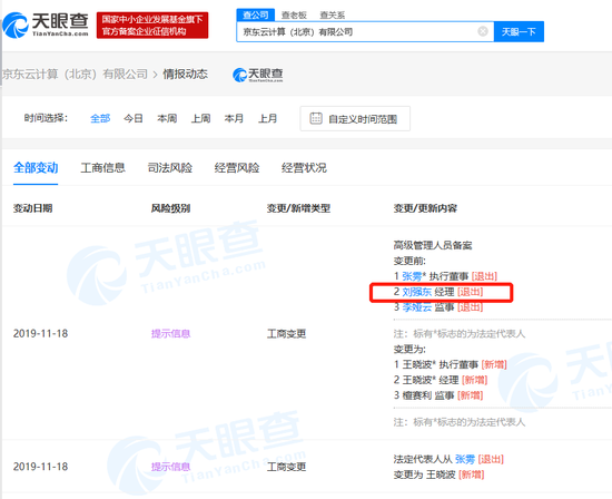 11月25日消息天眼查数据显示,11月18日,京东云计算(北京)有限公司发生工商变更,刘强东卸任经理一职,其助理张雱卸任该公司执行董事及法定代表人,同时退出的还有监事李娅云;新增王晓波为执行董事、经理及法定代表人,新增檀赛利为监事。
