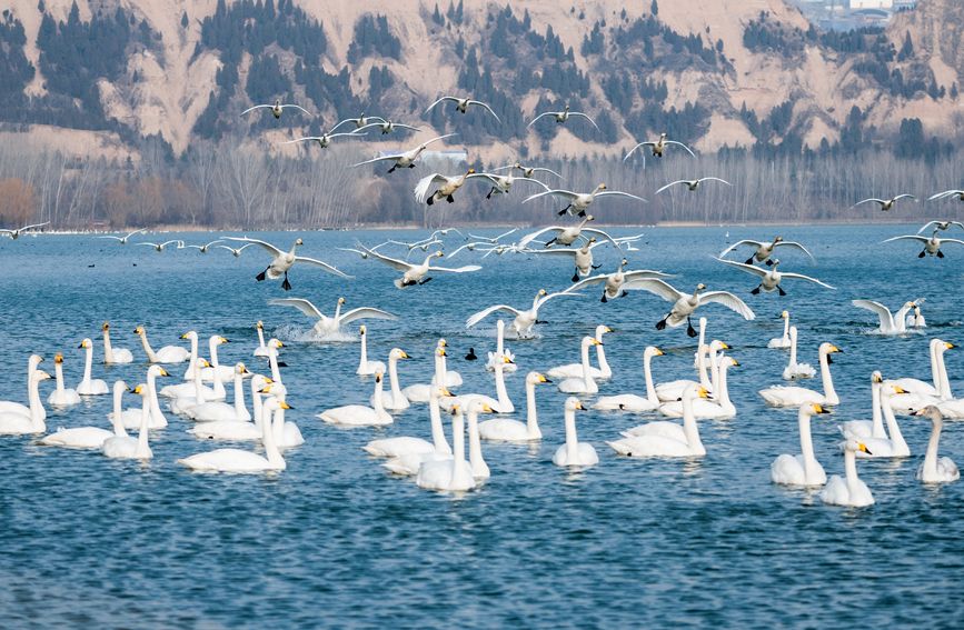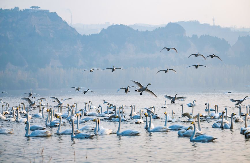 首页 山西平陆:黄河湿地天鹅舞 2022-11-21 08:46:18 分享 近日,数千只白天鹅陆续从西伯利亚飞临运城市平陆黄河湿地越冬。它们在此嬉戏、觅食,为初冬的黄河湿地增添一份和谐与灵动。据了解,平陆县域内占地6000多公顷的黄河湿地位于山西、河南两省交界处,气候温和,食物丰富,成为大天鹅越冬的主要栖息地之一。近年来,随着平陆黄河湿地生态环境的不断改善,到此越冬的天鹅数量逐年增加。(解丽霞摄)(责编:雷昊、桑莉媛)