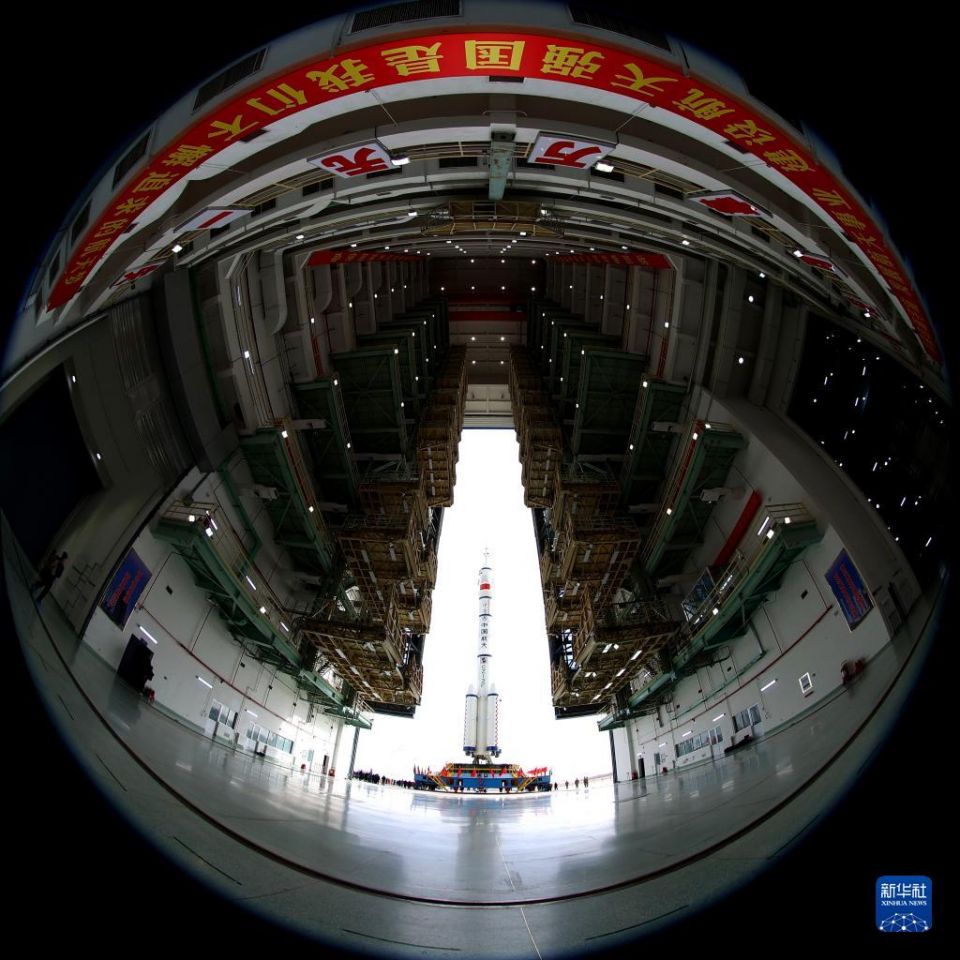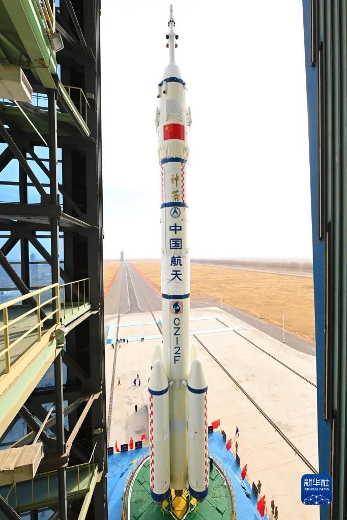 11月21日,神舟十五号载人飞船与长征二号F遥十五运载火箭组合体在转运途中。新华社发(李昀锡 摄)