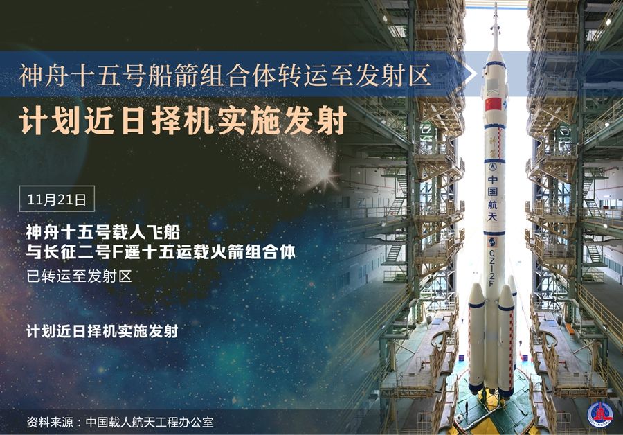 新华社酒泉11月21日电(李国利、邓孟)记者从中国载人航天工程办公室获悉,11月21日,神舟十五号载人飞船与长征二号F遥十五运载火箭组合体已转运至发射区,计划近日择机实施发射。