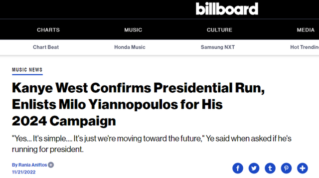 【环球网报道 记者 索炎琦】据美国音乐平台公告牌(Billboard)、美国哥伦比亚广播公司(CBS)等媒体21日报道,在2020年竞选美国总统失败后,美国歌手“侃爷”坎耶·韦斯特在刚刚过去的这个周末确认,他将参加2024年美国总统大选。