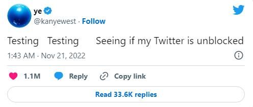 此 外,近段时间以来,“侃爷”还因涉嫌反犹言论陷入争议,被推特、Instagram等多家社交媒体禁言。不过,据美国哥伦比亚广播公司(CBS)11月 20日最新报道,韦斯特于当天“重返推特”,他本人也在当天发了条测试是否已被解禁的推特:“测试。测试。看看我的推特账号是否已经解除屏蔽了。”
