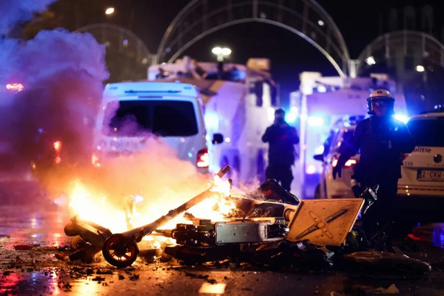 据报道,数十名骚乱者放火烧台阶,并向汽车投掷砖头。布鲁塞尔警方发言人伊尔斯·范德基尔(Ilse Van de Keere) 说,有一人脸部受伤后,现场出动了100多名防暴警察。