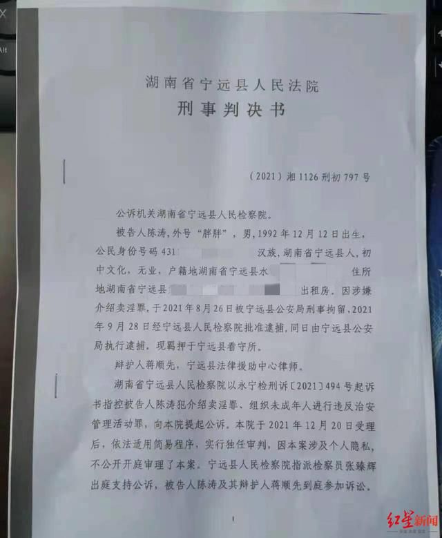 湖南省宁远县人民法院所作的一份刑事判决书显示,自去年7月以来,被告人陈涛为谋取非法利益,介绍未成年人进行卖淫活动,犯介绍卖淫罪、组织未成年人进行违反治安管理活动罪,共判处有期徒刑一年四个月。