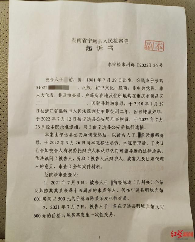 陈 某生提供的另一份起诉书显示,陈某某经陈涛介绍与他人发生性关系时,未满十四周岁。该起诉书为永宁检未刑诉(2022)26号,作出的时间为今年10月 26日。起诉书称,2021年7月5日,被告人于某前经陈涛(已判决)介绍明知陈某某系未满十四周岁的未成年人,仍在宁远县明城宾馆601房间,以500 元的价格与陈某某发生性交易。