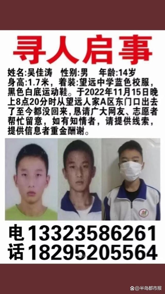 吴佳涛今年14岁,是宁夏银川永宁县的初三学生。11月15日20时20分左右,吴佳涛从永宁县望远镇望远人家小区A区东门口走出去,当时他没带手机,也没带身份证。