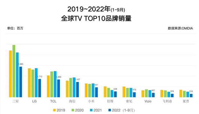 全 球数据提供商Omdia发布的数据则显示,2022年前三季度全球电视销量/销售额排名,三星电子以20.2%位居榜首,之后依次是LG电子(12%)、 TCL(11.7%)、海信(10.1%)、小米(6.5%);从销售额维度看,三星电子市场份额为30.2%,稳居第一;LG电子市场份额为17%,排 名第二;TCL市场份额为9.3%,排名第三;海信市场份额为8.6%,排名第四;索尼市场份额为8%,排名第五。
