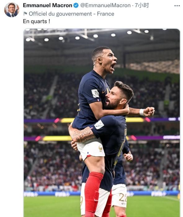中新网12月5日电 综合外媒报道,卡塔尔世界杯八分之一决赛中,卫冕冠军法国队3:1战胜波兰。赛后,法国总统马克龙在社交媒体发文祝贺法国队成功挺进八强。