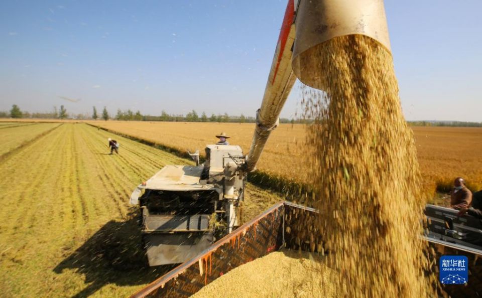 山东省临沂市郯城县郯城街道农民将收获的水稻装车(10月23日摄)。新华社发(张春雷 摄)