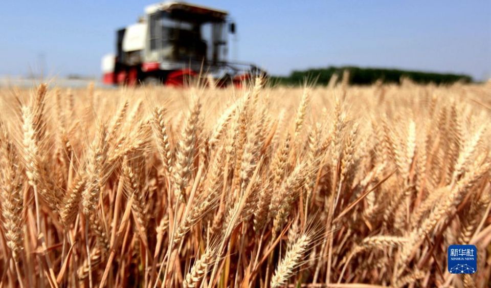 山东省临沂市平邑县农民驾驶收割机在田间收获小麦(6月8日摄)。新华社发(武纪全 摄)
