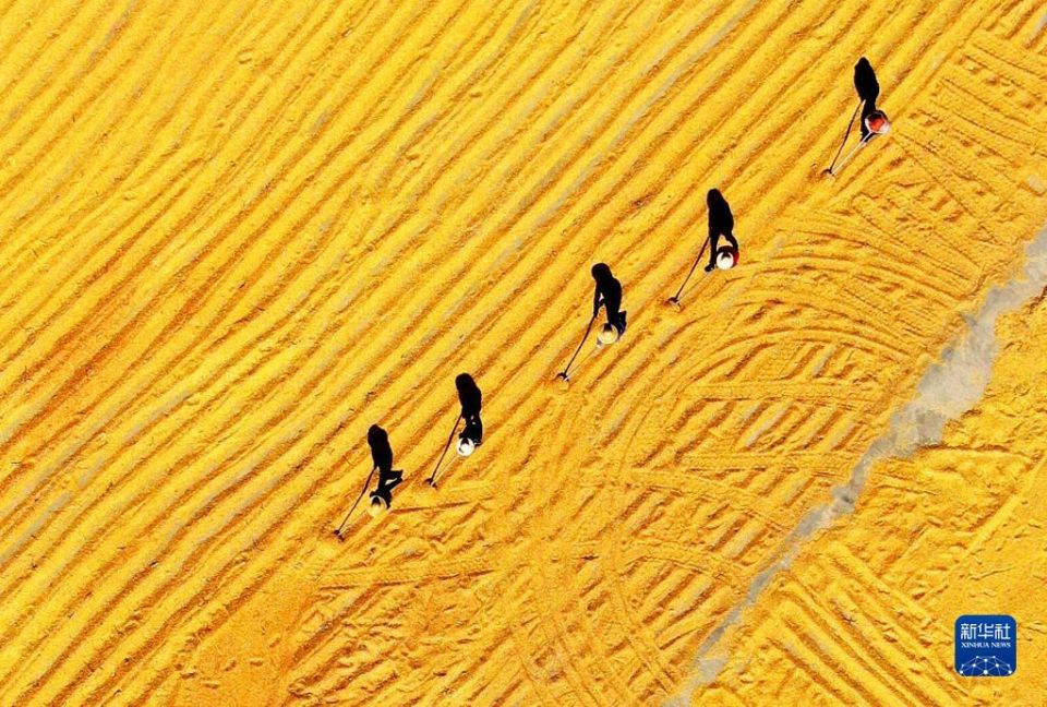 山东省临沂市平邑县农民在晾晒收获的玉米(无人机照片,10月23日摄)。新华社发(武纪全 摄)