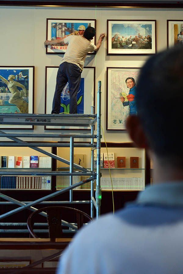 9月28日,中央总馆“真理之光”展区,工作人员在调整展陈。