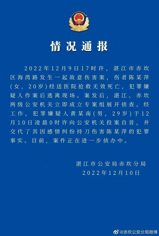 12月10日晚,广东湛江警方针对此发布警情通报,伤者经抢救无效死亡,犯罪嫌疑人已向公安机关投案自首,并交代了其因感情纠纷持刀伤害女子的犯罪事实。目前,案件正在进一步侦办中。