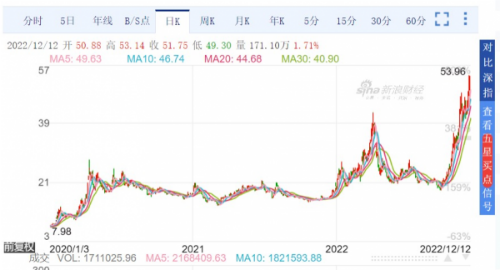 与此同时,以岭药业的股价连续暴涨。从2020年以来,累计涨幅超过了500%。其中2022年12月以来,涨幅最高达到20.18%。2022年12月12日,以岭药业收于51.75元/股,上涨1.71%,总市值达到864.59亿元。