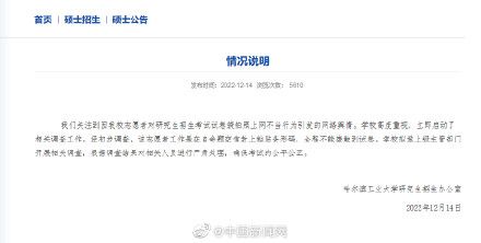 14日,哈尔滨工业大学研究生招生网发布情况说明:我们关注到因我校志愿者对研究生招生考试试卷袋拍 照上网不当行为引发的网络舆情。学校高度重视,立即启动了相关调查工作。经初步调查,该志愿者工作是在自命题空信封上粘贴条形码,全程不能接触到试卷。学 校拟邀上级主管部门开展相关调查,根据调查结果对相关人员进行严肃处理,确保考试的公平公正。来源:中国新闻网