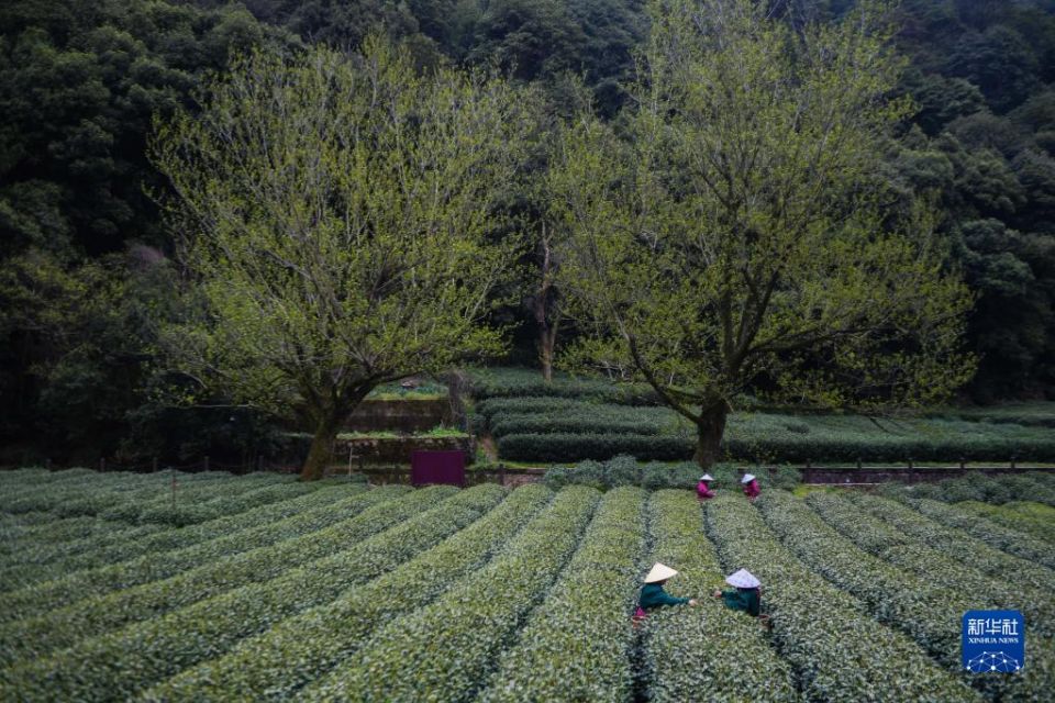 浙江杭州西湖龙井茶一级保护区梅家坞村的茶农在采摘西湖龙井“明前茶”(2022年3月18日摄)。