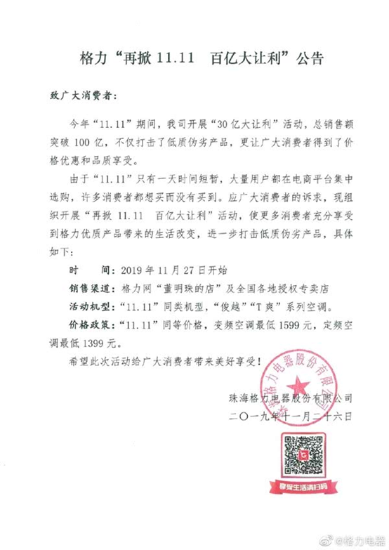 所以经过调整后,将重新开展“再掀11.11百亿大让利”活动,让更多消费者充分享受到格力优质产品带来的生活改变,进一步打击低质伪劣产品。