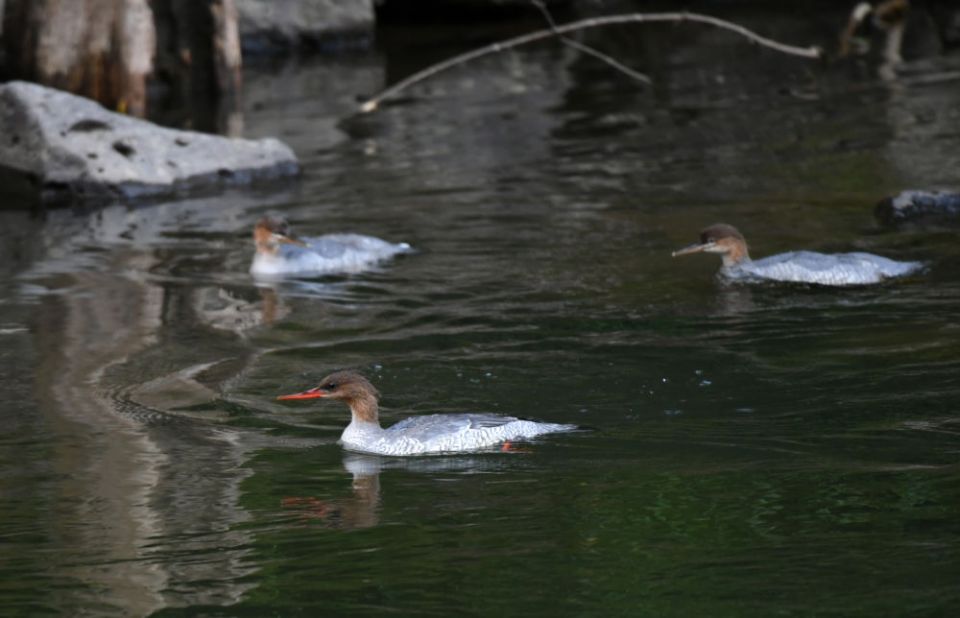 几只中华秋沙鸭在长白山国家级自然保护区头道自然保护站水域戏水(2020年7月7日摄)。新华社记者 林宏 摄