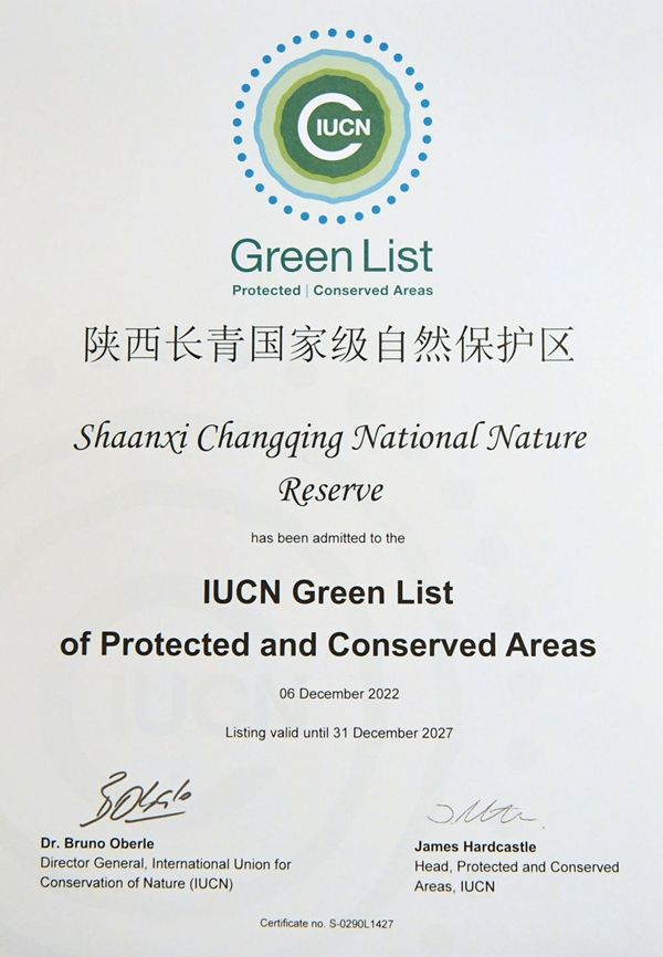这是在加拿大蒙特利尔拍摄的陕西长青国家级自然保护区获得的世界自然保护联盟绿色名录证书(2022年12月14日摄)。新华社记者 任鹏飞 摄