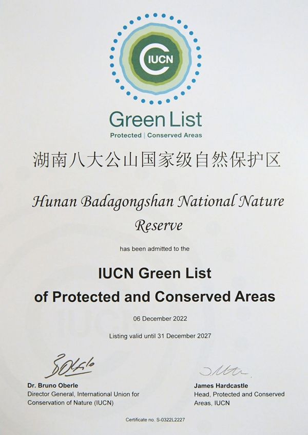 这是在加拿大蒙特利尔拍摄的湖南八大公山国家级自然保护区获得的世界自然保护联盟绿色名录证书(2022年12月14日摄)。新华社记者 任鹏飞 摄