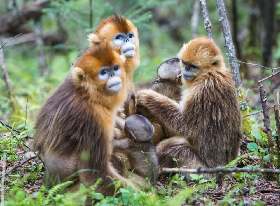 金丝猴在神农架国家公园大龙潭金丝猴野外研究基地山林中活动(2021年5月19日摄)。新华社记者 肖艺九 摄
