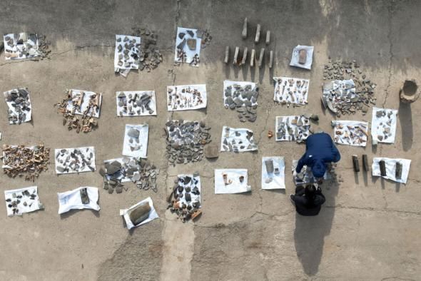 12月16日,考古人员正在对河北柏人城遗址发掘的部分遗存进行清理分类。(陈雷摄)