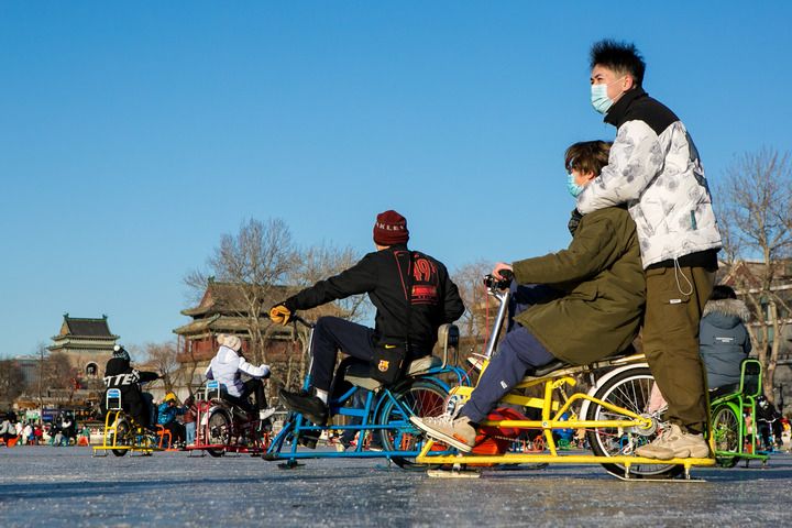 1月15日,市民游客在北京什刹海冰场骑冰上自行车。新华社记者 李京 摄