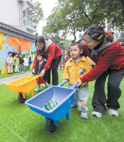 浙江省杭州市西湖区北山街道松木场社区通过加装电梯、整治小区外立面、增设公共绿地、建设邻里中心与托育中心等措施实施老旧小区改造。图为在新建成的社区托育中心,老师带着小朋友们玩游戏。 |