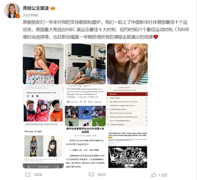 26日,谷爱凌在社交媒体上晒出多张图片,感谢朋友们一年来的支持、鼓励和爱护,并回顾了2022年斩获的多个“最佳时刻”。此外,她也向粉丝们报喜,“在斯坦福第一学期所有的课程满分。”