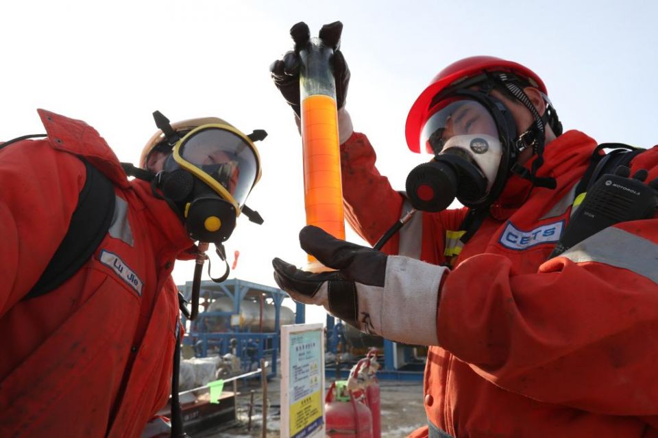 石油工人正在观看富满油田单井中的油样。(中国石油塔里木油田公司供图)