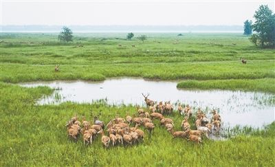 一群麋鹿在湖北石首麋鹿国家级自然保护区内活动。新华社记者 肖艺九 摄