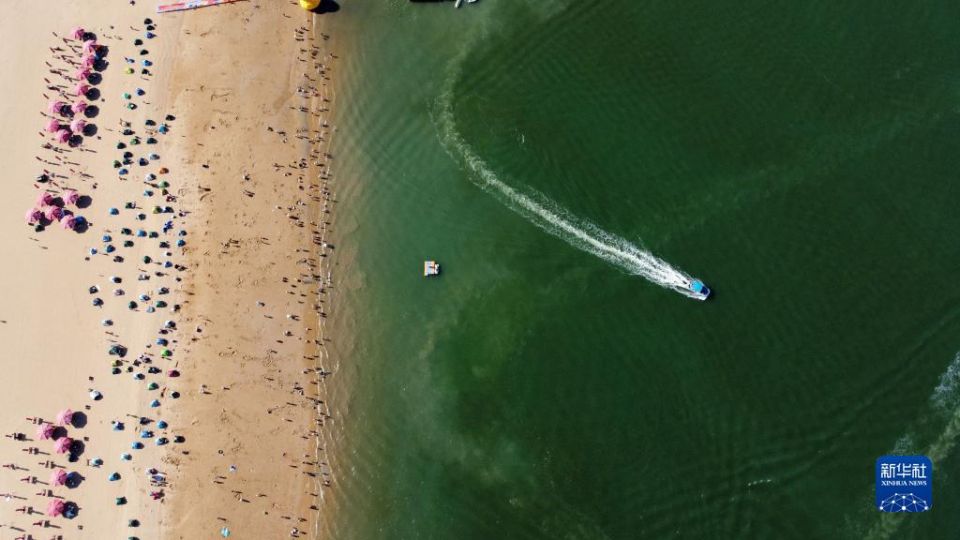 2021年6月5日,游客在天津市滨海新区东疆港人工沙滩游玩(无人机照片)。近年来,天津坚持渤海治污与岸线治理相结合,启动岸线和滨海湿地整治、修复等项目。新华社记者 赵子硕 摄