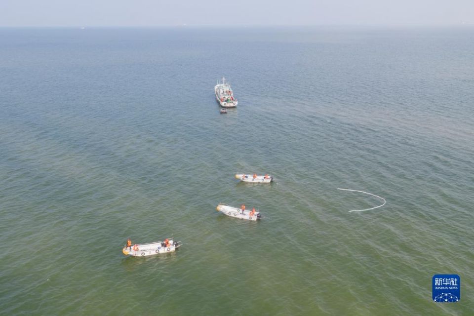 2021年6月1日,环卫工人在三都澳海域打捞海漂垃圾。近年来,福建省宁德市加强海漂垃圾综合整治工作,成立专业海上环卫公司,清理转运海岸线附近海域的海漂垃圾,保护海洋环境。新华社记者 姜克红 摄