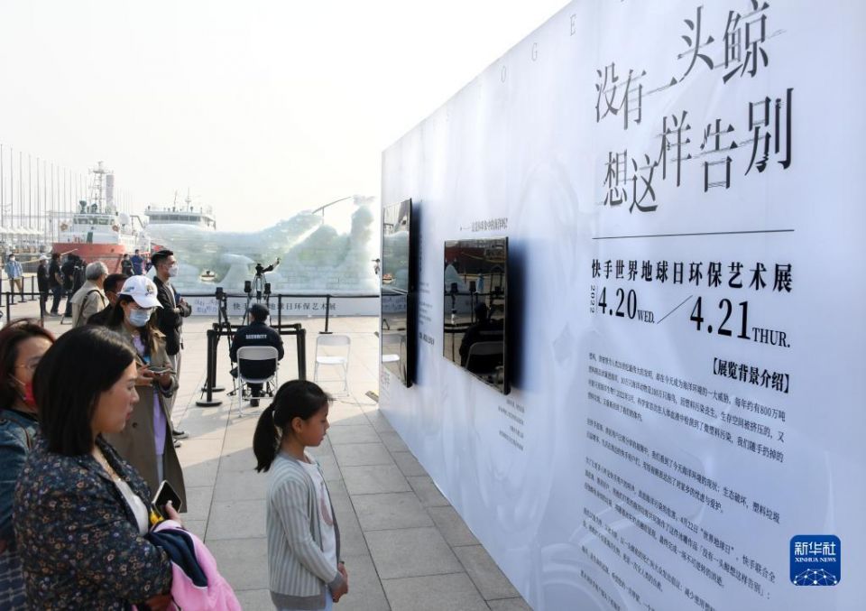 2022年4月20日,游客在山东青岛奥林匹克帆船中心观看“没有一头鲸想这样告别”环保艺术展介绍。展览旨在倡导人们爱护海洋动物、认识海洋垃圾的危害、提高海洋生态保护意识。新华社记者 李紫恒 摄