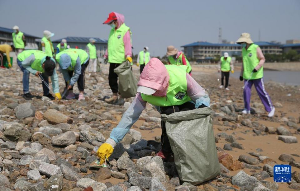 2022年6月8日,志愿者在江苏连云港海州湾国家级海洋公园清理海滩上的垃圾。新华社发(王健民 摄)