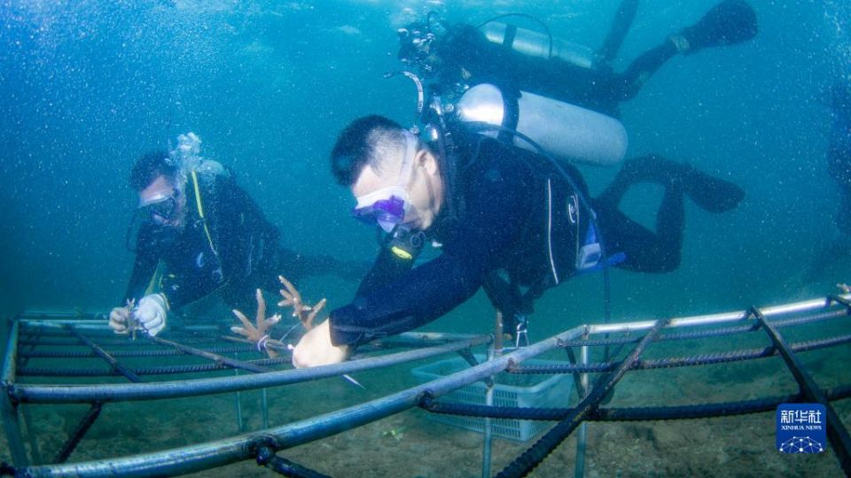 2022年6月7日,在海南省陵水黎族自治县分界洲岛附近海域,海南省海洋与渔业科学研究院的专家和分界洲岛旅游区工作人员在移植珊瑚,努力保护海域的珊瑚礁生态系统。新华社记者 张丽芸 摄