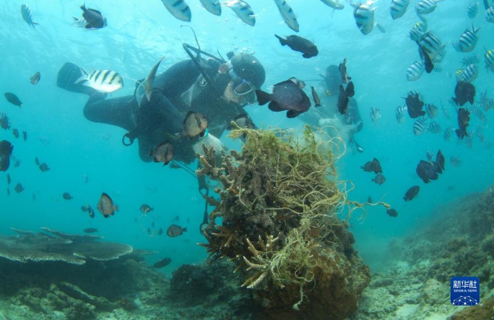 2021年9月14日,在海南三亚蜈支洲岛海域,工作人员在海底清理缠绕在珊瑚上的渔网和绳子。新华社记者 杨冠宇 摄