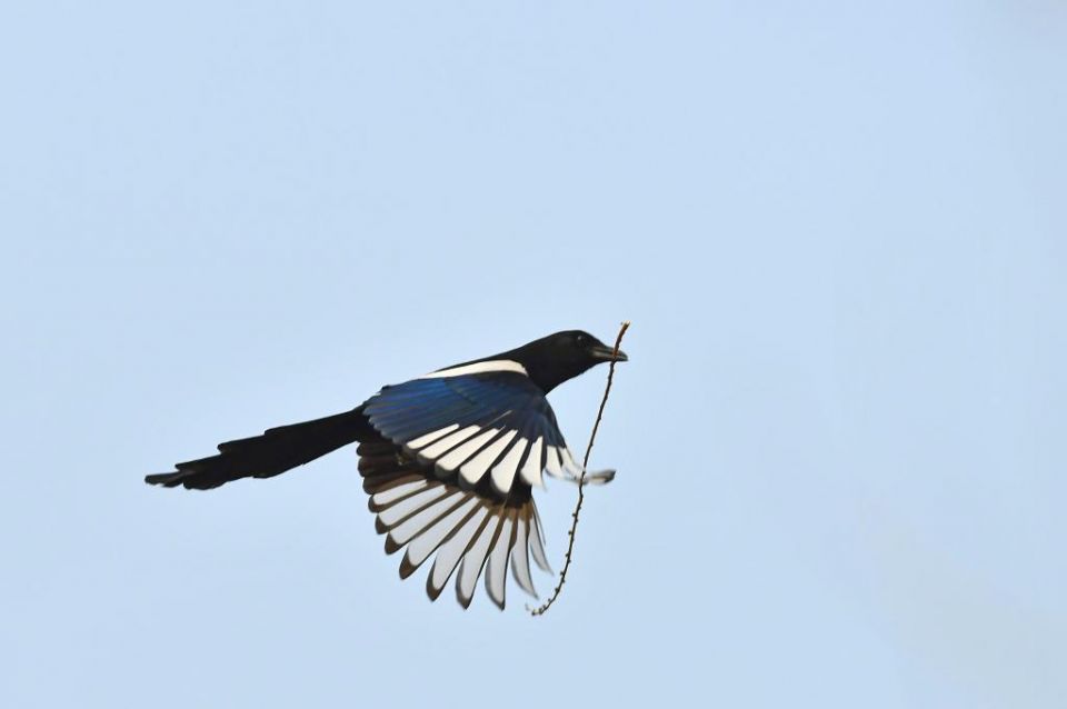 在山东省滕州市西岗镇,喜鹊叼着树枝准备筑巢。新华社发(李志军摄)