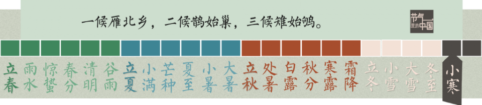 动物往往对气候的变化最为敏感。小寒有三候:一候雁北乡,二候鹊始巢,三候雉始鸲。大雁感受到阳气的萌发,因而开始向北迁移;北方随处可见的喜鹊,感觉春意来临,便开始筑巢繁衍;雉鸡发出求偶的声音,为了春天里的爱情而开始鸣叫。鸟类的变化,无一不透露春之希望。