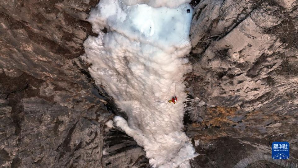 首页 河北邢台:壮美冰壁引客来 2023-01-09 09:11:49 分享 1月8日,在云梦山景区,攀冰爱好者在冰壁上攀爬(无人机照片)。近日,河北邢台市云梦山景区内的七叠瀑形成壮观冰壁,吸引不少游客前来游玩。攀冰爱好者借助专业工具,在专职教练的指导下体验攀冰,成为太行山冬日里一道别样风景。新华社记者 骆学峰 摄