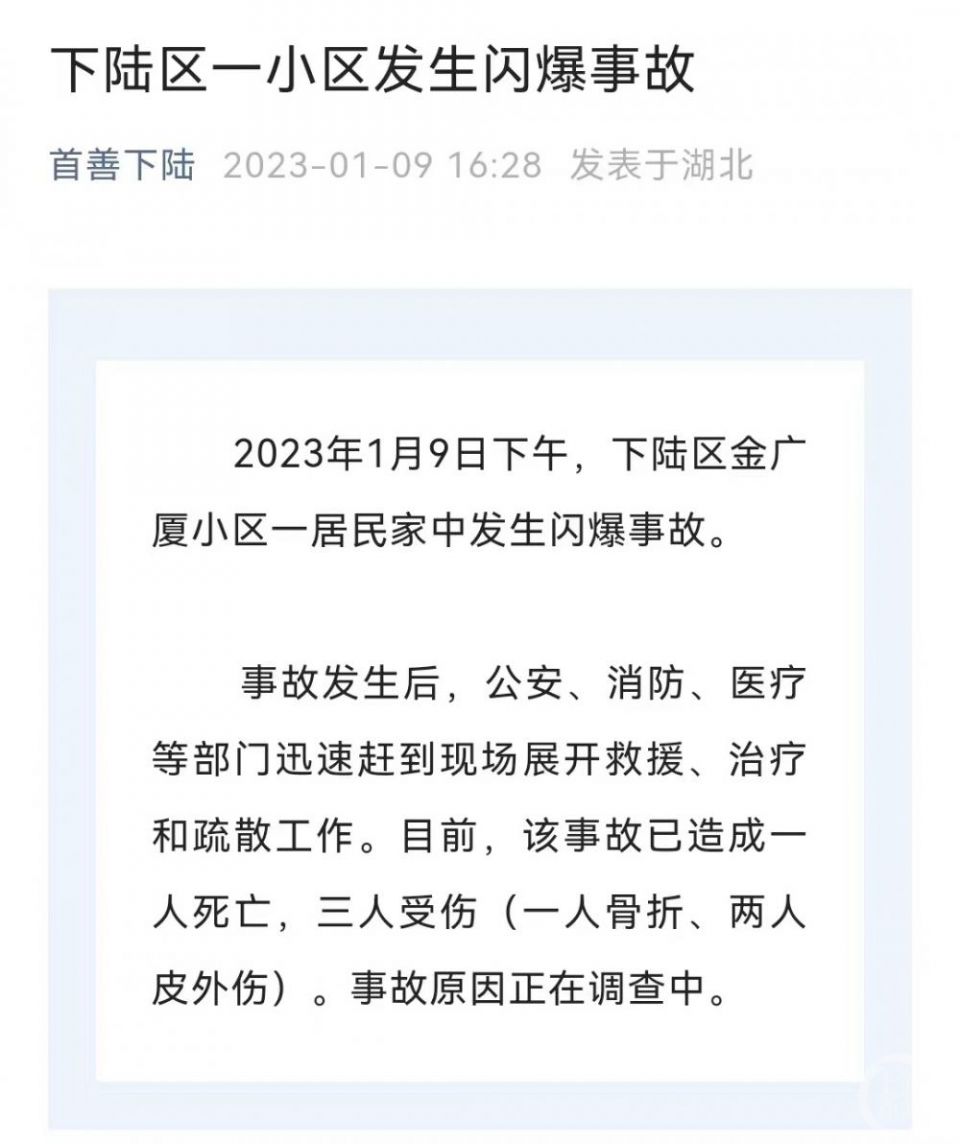 下陆区官方发布的通报称,1月9日下午,下陆区金广厦小区一居民家中发生闪爆事故。事故发生后,公安、消防、医疗等部门迅速赶到现场展开救援、治疗和疏散工作。目前,该事故已造成一人死亡,三人受伤(一人骨折、两人皮外伤)。