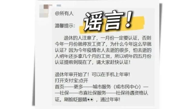近日,有网友发帖咨询:近期微信群广泛流传“因疫情原因,本月不进行社保资格认证的退休人员,将停发一月份工资”信息,请问此消息是否属实?