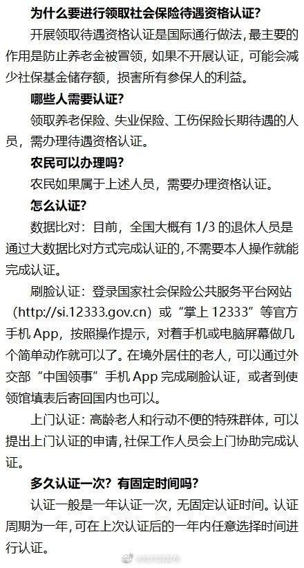 领 取养老金待遇资格认证是防范养老金被恶意冒领、防止社保基金流失的重要措施。国家人社部办公厅《关于印发<领取社会保险待遇资格确认经办规程(暂 行)>的通知》(人社厅发(2018〕107号)规定:“领取养老金待遇人员每年至少应进行一次领取待遇资格认证”。“对领取待遇未认证人员和采取 其它手段无法联系到本人的,社保经办机构可办理待遇暂停手续,对办理了待遇暂停手续的人员,若3个月内无人提出异议将停发待遇”。