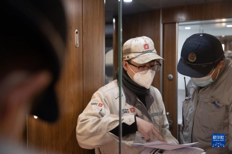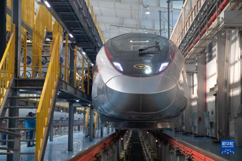 1月16日,工作人员在中国铁路哈尔滨局集团有限公司哈尔滨动车段检修车间内准备检查入库的CR400BF-GZ型复兴号高寒智能动车组。 新华社记者 张涛 摄