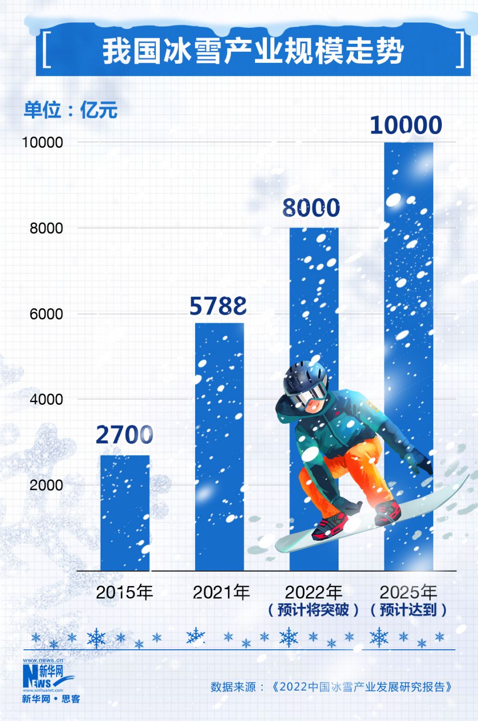 我国具有发展冰雪产业的天然禀赋。以成功举办冬奥会为契机,短短几年间,我国冰雪产业“出山海 关”“过长江”“越秦岭”,形成了“东南西北遥相呼应、四季经营各具特色、冰上雪上全面开花”的新格局。《2022中国冰雪产业发展研究报告》称,我国冰 雪产业市场规模增幅明显,2022年冰雪产业总规模预计将超过8000亿元,并有望在2025年步入成熟期,市场规模突破1万亿元。