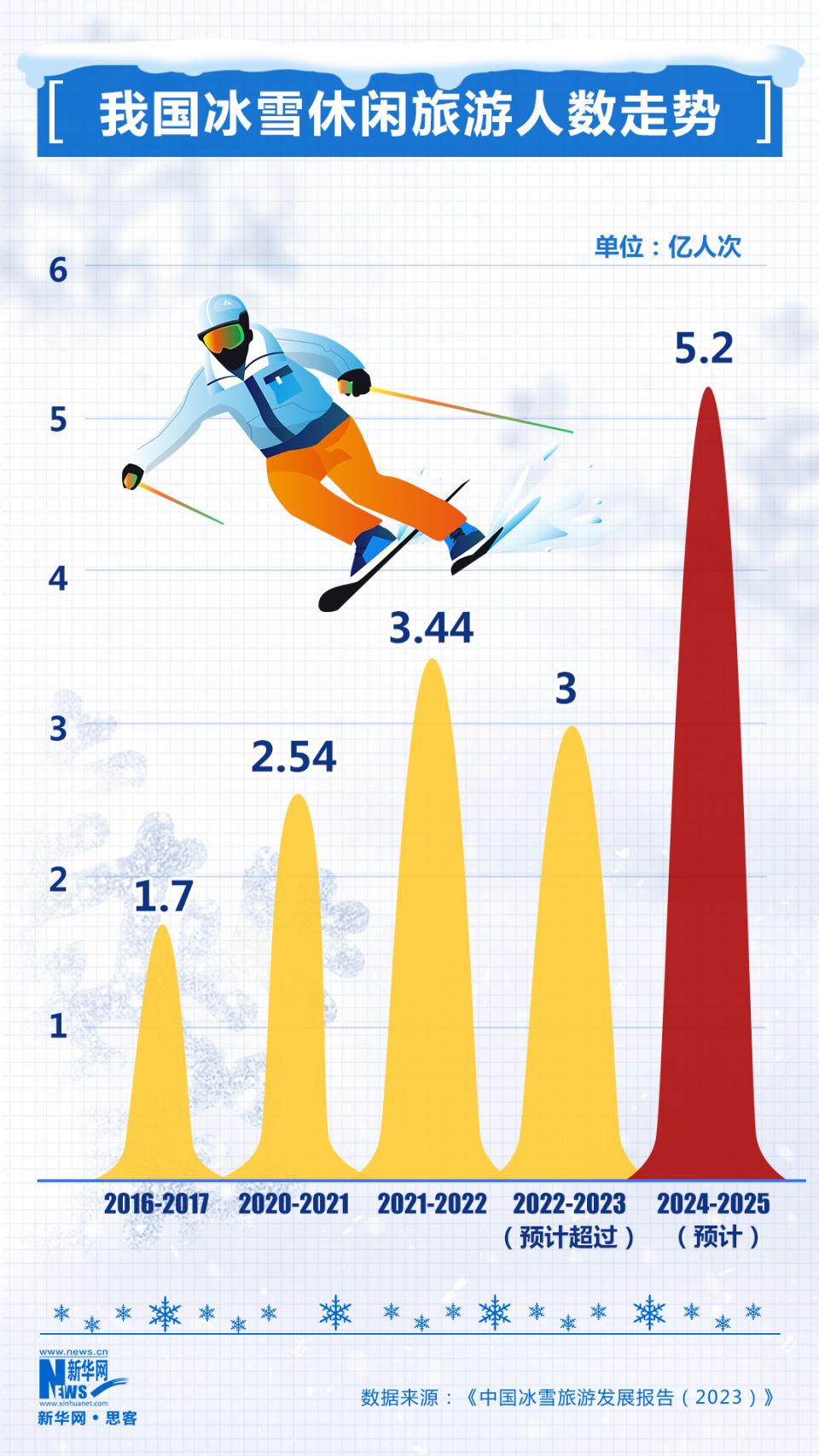 《中国冰雪旅游发展报告(2023)》预测,在本地市场消费潜力持续释放和远程冰雪游复苏下,预计2022至2023年冰雪季我国冰雪休闲旅游人次仍会超过3亿;“十四五”末期的2024至2025年冰雪季我国冰雪休闲旅游人次有望达到5.2亿。
