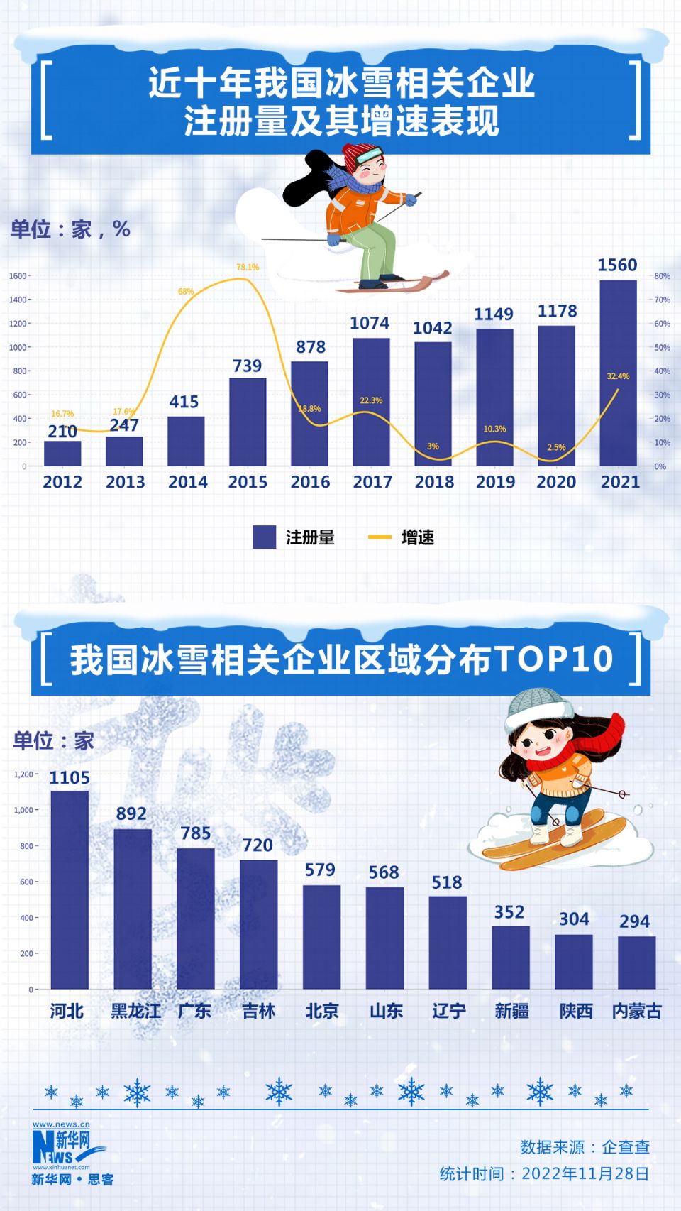 冰雪产业持续注入红利,也激活了更多企业布局冰雪产业的信心。企查查数据显示,近十年,我国冰雪 相关企业注册量整体逐年增加,现存9113家,2022年上半年新增833家,同比增加16.7%。从区域分布来看,河北现存1105家冰雪相关企业,位 列全国区域第一,其次是黑龙江现存892家,广东现存785家。