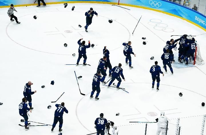 ↑2022年2月20日,芬兰队在夺冠后庆祝。