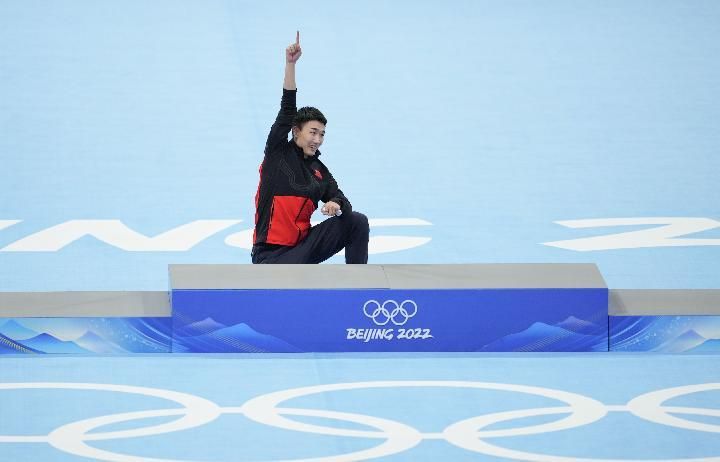 ↑2022年2月12日,中国选手高亭宇在比赛后庆祝。
